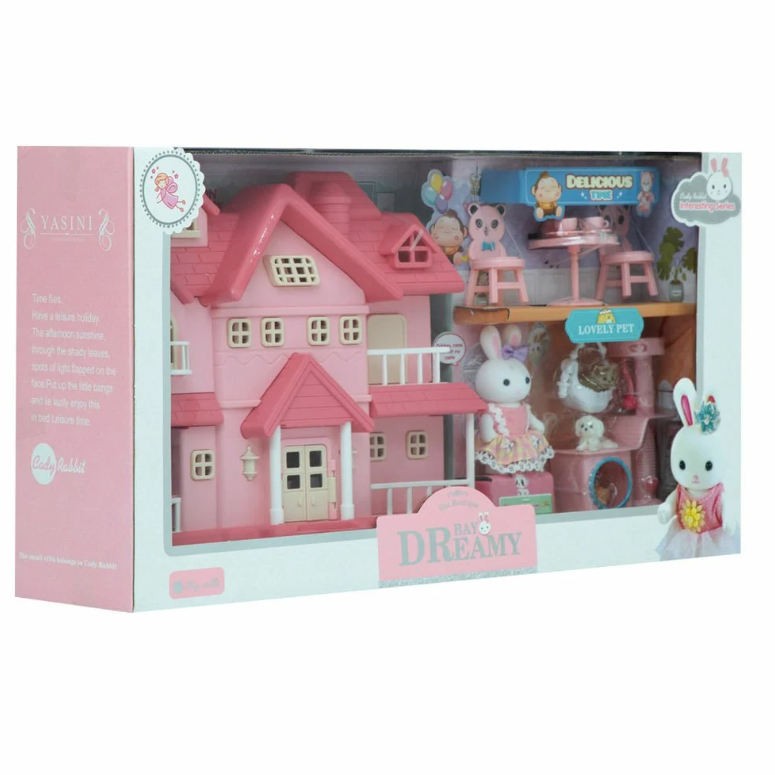 Cette charmante maison de poupées rose est accompagnée d’une famille de petits lapins en peluche et d’accessoires de mobilier tels que des chaises et une table. La maison est idéale pour des jeux de rôle amusants et créatifs, permettant aux enfants d’explorer des scénarios de vie quotidienne avec leurs personnages préférés.